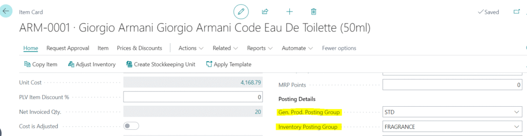 - To check a G/L (General Ledger) account where the user wants to add a budget. For example: STD and FRAGRANCE are mentioned in the Gen. Prod. Posting Group and Inventory Posting Group fields for an Item ARM-0001 as highlighted in the Image below