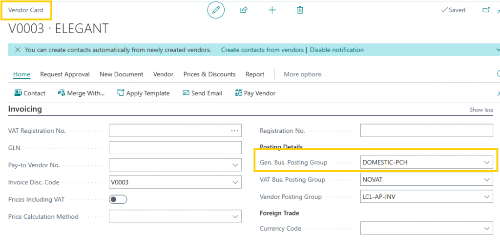 - Check the combination of Gen. Bus. Posting Group (mentioned the vendor card from whom users are purchasing items Refer to Image 8) and Gen. Prod. Posting Group and G/L account are mentioned in the Purchase Account column as highlighted in the image below